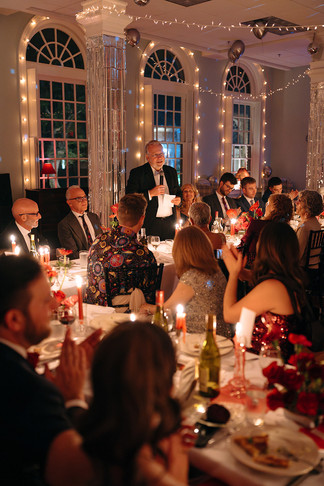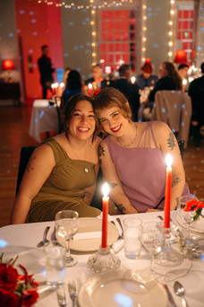 Grace and Kris planned an intimate, casual, 60 person wedding. They told me they aren't traditional wedding people, but they decided the most important part for them was to celebrate with their loved ones. They wanted the celebration to be people-focused, and it was important for their wedding photos to reflect that intention. Grace's dad married them in his church's courtyard, then everyone moved inside to the church hall for dinner and dancing. The inspiration for their wedding design was "retro/nostalgic feel of receptions in the 1940s-50s with lots of kitschy decor, tinsel, hearts, etc!" Their intention for their photos was to feel very personal and celebratory- focusing on the dinner and party aspect the most and leaving out a lot of the traditional elements (bridal party, white dress, first dances, etc).